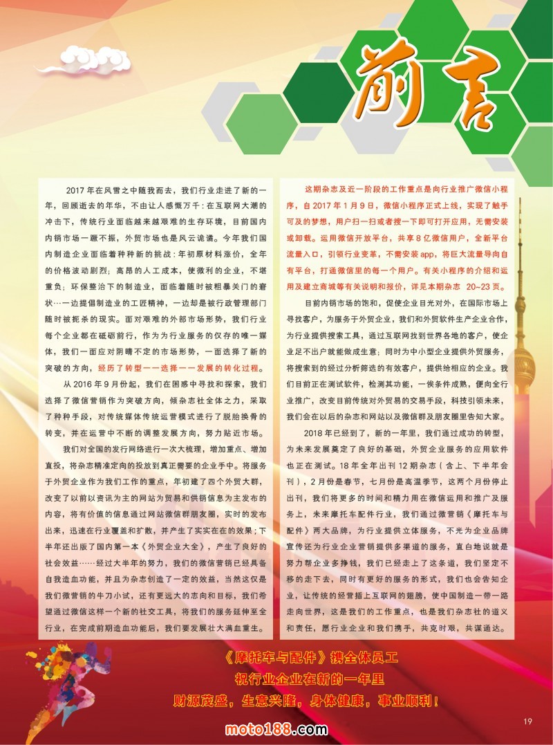 2018年已經到了,新的一年里,我們通過成功的轉型,為未來發展奠定了良好的基礎,外貿企業服務的應用軟件也正在測試。18年全年出刊12期雜志(含上、下半年會刊),2月份是春節,七月份是高溫季節,這兩個月份停止出刊,我們將更多的時間和精力用在微信運用和推廣及服務上,未來摩托車配件行業,我們通過微營銷《摩托車與配件》兩大品牌,為行業提供立體服務,不光為企業品牌宣傳還為行業企業營銷提供多渠道的服務,直白地說就是努力幫企業多掙錢,我們已經走上了這條道,我們堅定不移的走下去,同時有更好的服務的形式,我們也會告知企業,讓傳統的經營插上互聯網的翅膀,使中國制造一帶一路走向世界,這是我們的工作重點,也是我們雜志社的道義和責任,愿行業企業和我們攜手,共克時艱,共謀通達。