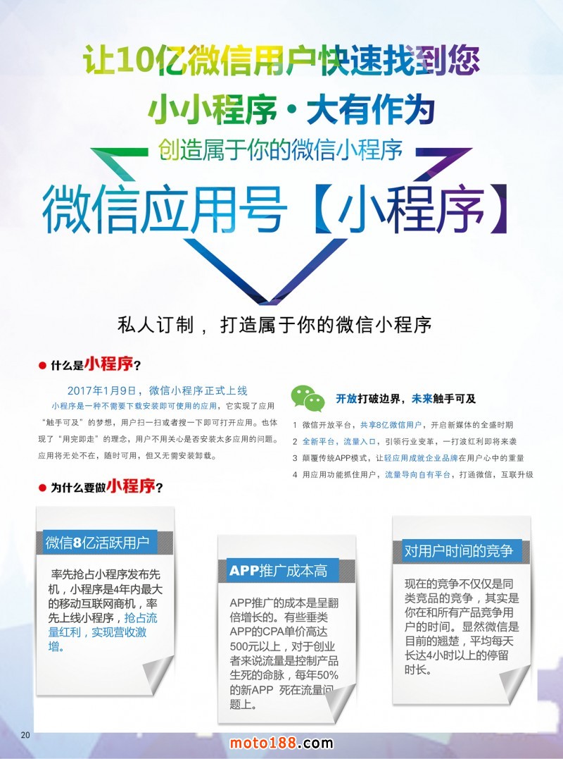 這期雜志及近一階段的工作重點是向行業推廣微信小程序,自2017年1月9日,微信小程序正式上線,實現了觸手可及的夢想,用戶掃一掃或者搜一下即可打開應用,無需安裝或卸載。運用微信開放平臺,共享8億微信用戶,全新平臺流量入口,引領行業變革,不需安裝app,將巨大流量導向自有平臺,打通微信里的每一個用戶。有關小程序的介紹和運用及建立商城等有關說明和報價,詳見本期雜志? 20~23頁。