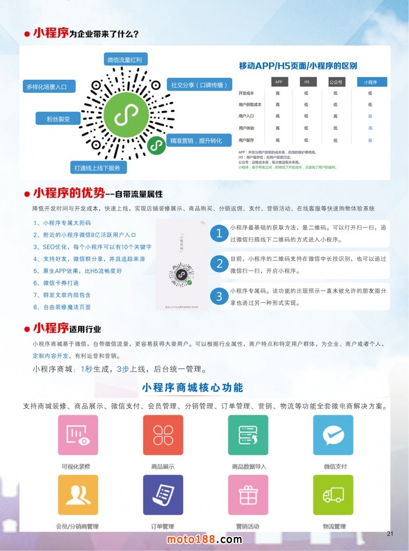 這期雜志及近一階段的工作重點是向行業推廣微信小程序,自2017年1月9日,微信小程序正式上線,實現了觸手可及的夢想,用戶掃一掃或者搜一下即可打開應用,無需安裝或卸載。運用微信開放平臺,共享8億微信用戶,全新平臺流量入口,引領行業變革,不需安裝app,將巨大流量導向自有平臺,打通微信里的每一個用戶。有關小程序的介紹和運用及建立商城等有關說明和報價,詳見本期雜志? 20~23頁。