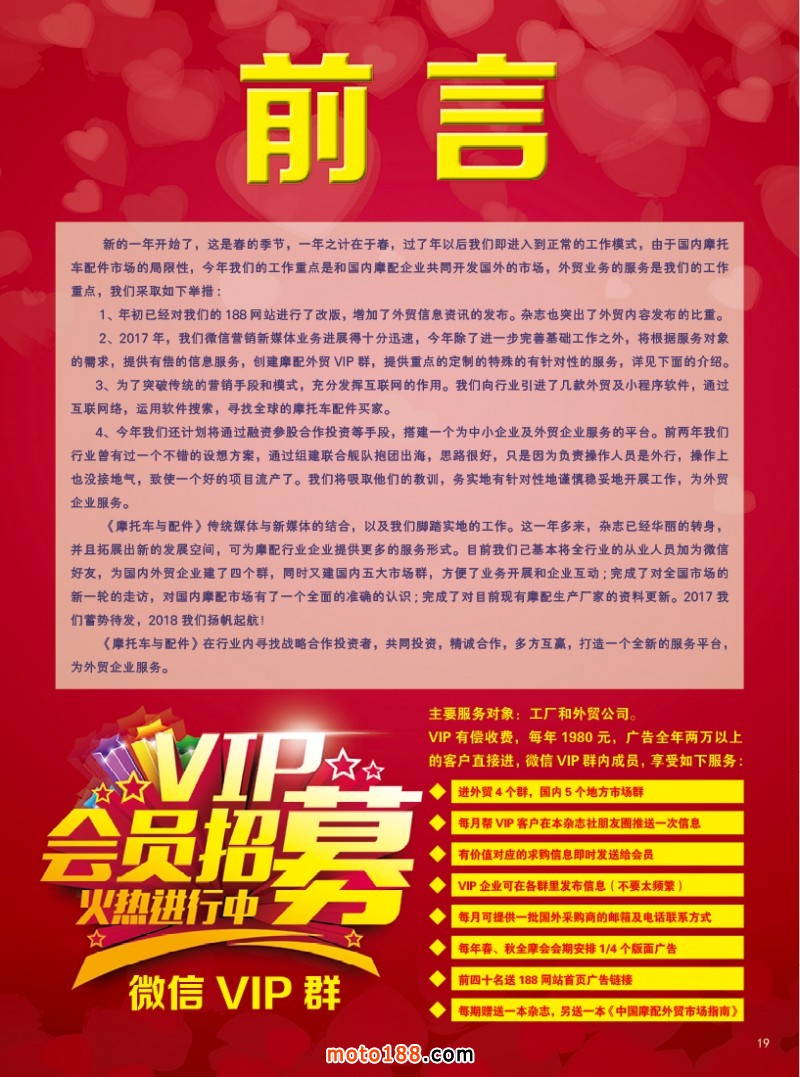 《摩托車與配件》傳統(tǒng)媒體與新媒體的結(jié)合,以及我們腳踏實地的工作。這一年多來,雜志已經(jīng)華麗的轉(zhuǎn)身,并且拓展出新的發(fā)展空間,可為摩配行業(yè)企業(yè)提供更多的服務(wù)形式。目前我們己基本將全行業(yè)的從業(yè)人員加為微信好友,為國內(nèi)外貿(mào)企業(yè)建了四個群,同時又建國內(nèi)五大市場群,方便了業(yè)務(wù)開展和企業(yè)互動;完成了對全國市場的新一輪的走訪,對國內(nèi)摩配市場有了一個全面的準(zhǔn)確的認(rèn)識;完成了對目前現(xiàn)有摩配生產(chǎn)廠家的資料更新。2017我們蓄勢待發(fā),2018我們揚(yáng)帆起航!