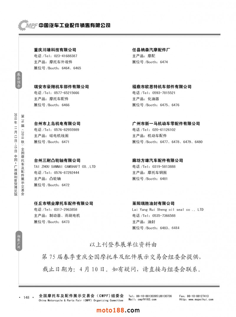 內148 第75屆(2018春)全國摩托車及配件展示交易會-重慶站參展企業信息