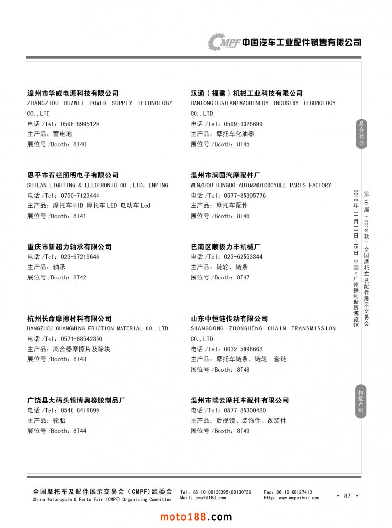 內(nèi)87 第75屆(2018春)全國摩托車及配件展示交易會(huì)-重慶站參展企業(yè)信息