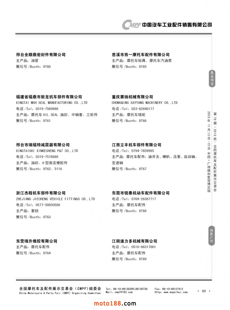 內89 第75屆(2018春)全國摩托車及配件展示交易會-重慶站參展企業信息