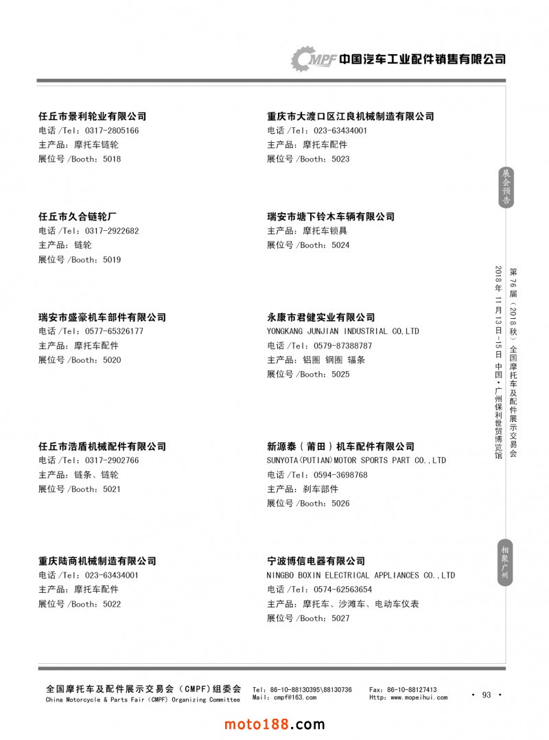 內(nèi)93 第75屆(2018春)全國(guó)摩托車及配件展示交易會(huì)-重慶站參展企業(yè)信息