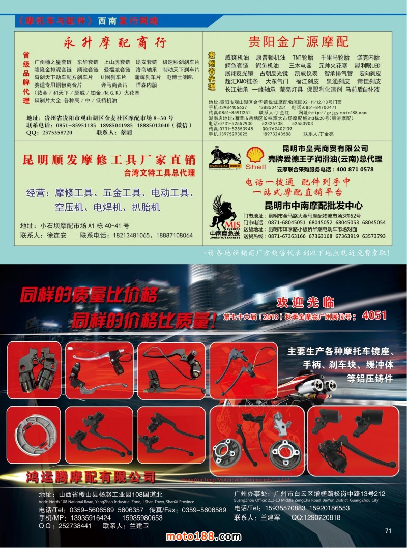從現(xiàn)在到10月上旬,我們還將對16年編撰的《摩配華南市場指南》進(jìn)行升級,中英文雙語出版,新版本將在下半年第76屆廣州全國摩托車及配件展示交易會首發(fā);并在廣州重慶摩配市場全面派送;在廣州福星、松南市場門口、及白云210/002/607三個(gè)檔口常年設(shè)立發(fā)行窗口;發(fā)行至廣州、重慶、江浙的主要廠家,目前收集整理、核對校正信息,編排翻譯的工作正在進(jìn)行之中,需要在最新《華南市場指南》升級版做宣傳的企業(yè),請和我們以及各地的工作站人員聯(lián)絡(luò)。