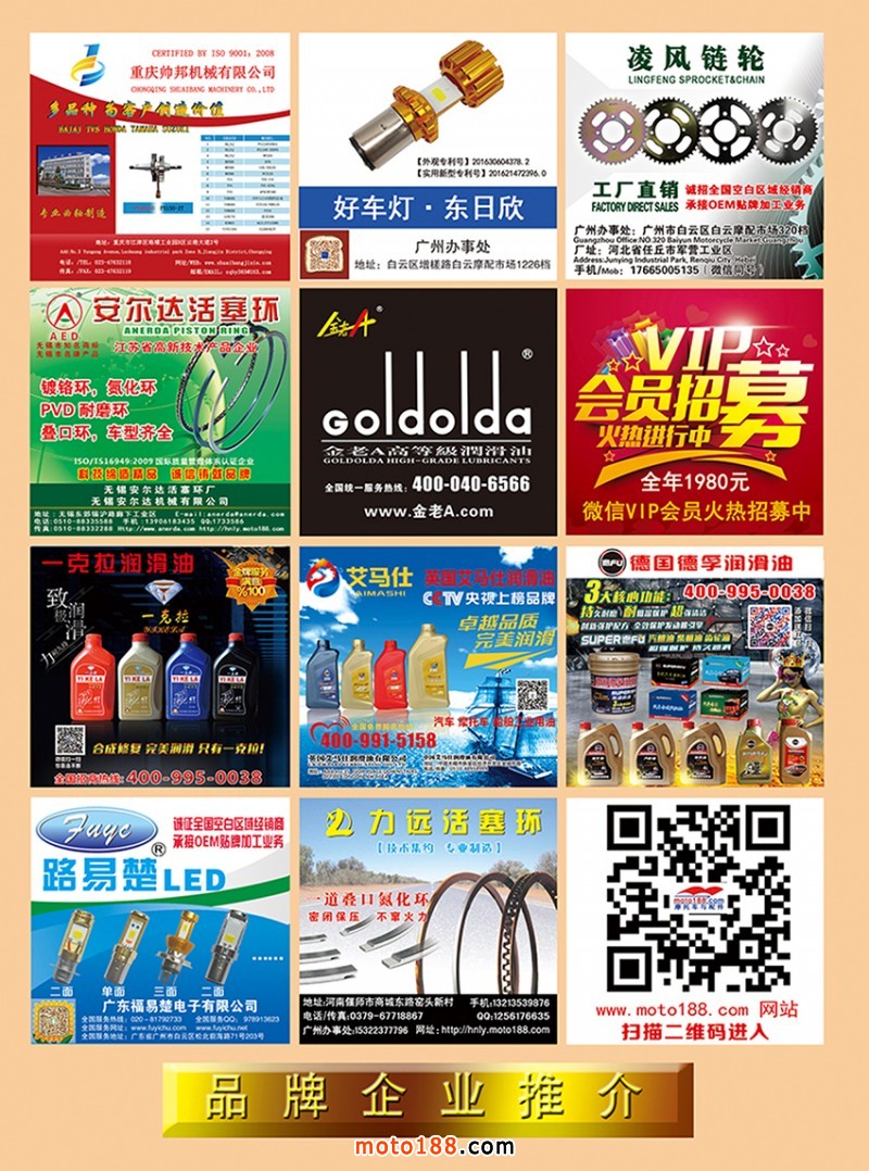 秋季廣州全摩會(huì)召開(kāi)在即,《摩配華南市場(chǎng)指南》升級(jí)版,將在下半年第76屆廣州全國(guó)摩托車及配件展示交易會(huì)首發(fā),歡迎參展企業(yè)和參展觀眾到3109展位領(lǐng)取;隨后在廣州、重慶摩配市場(chǎng)全面派送,在廣州福星、松南市場(chǎng)門(mén)口、及白云210/002/607三個(gè)檔口常年設(shè)立發(fā)行窗口;發(fā)行至廣州、重慶、江浙的幾大板塊主要廠家,需要在最新《華南市場(chǎng)指南》升級(jí)版做宣傳的企業(yè),請(qǐng)盡快和我們以及各地的工作站人員聯(lián)絡(luò),截稿在即,時(shí)不我待。