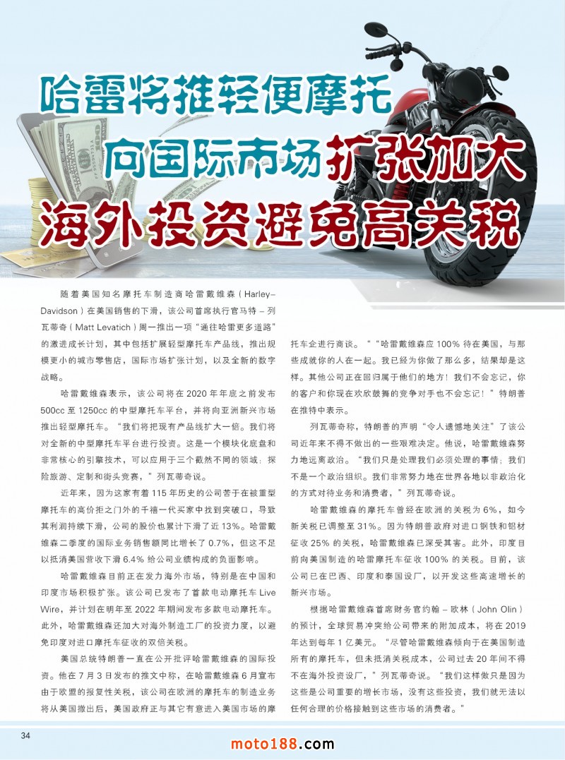 2018.10月《摩托車/電動車與配件》雜志,歡迎大家閱讀日期:2018-09-28 點擊:1534 查看原圖 全部展開![]() ![]() ![]() 內34 哈雷將推輕便摩托向國際市場擴張 加大海外投資避免高關稅