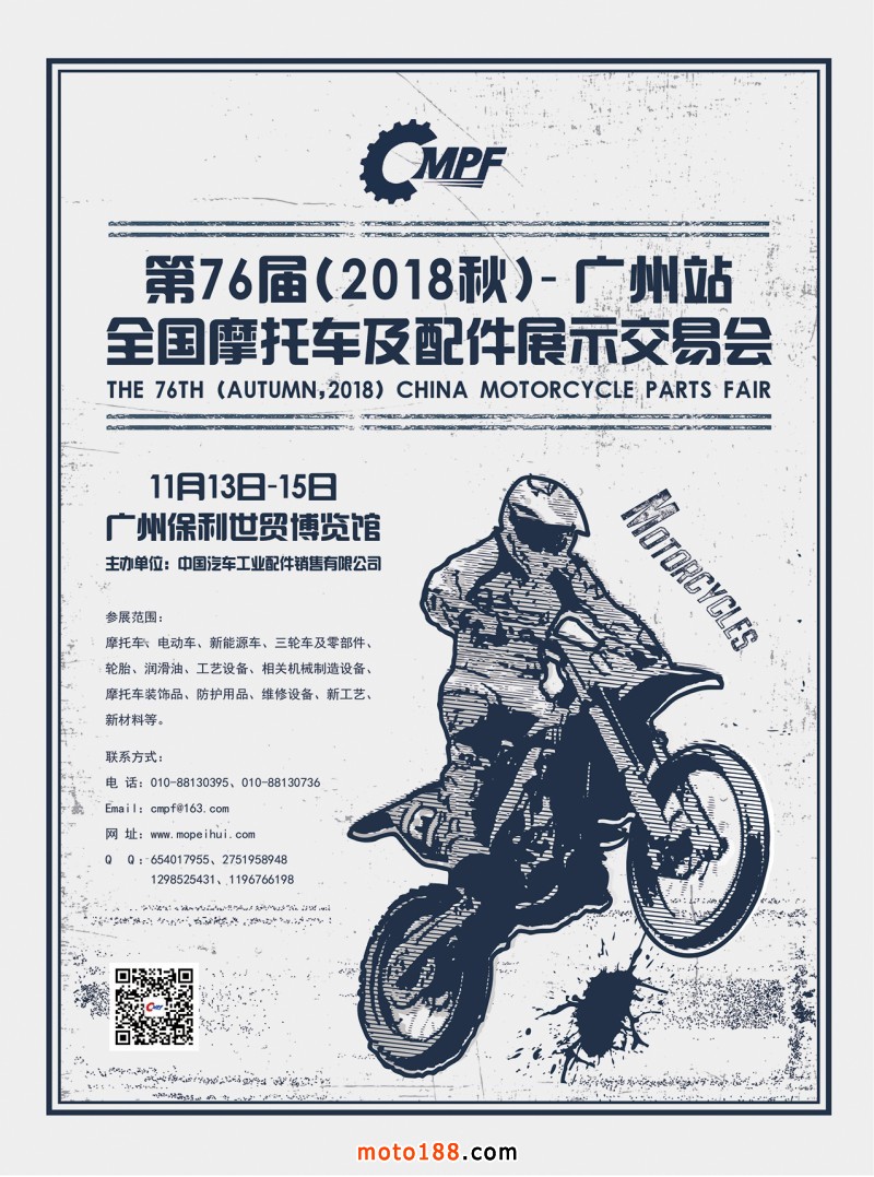 2018.10月《摩托車/電動車與配件》雜志,歡迎大家閱讀日期:2018-09-28 點擊:1533 查看原圖 全部展開![]() ![]() ![]() 封底 第76屆(2018秋)-廣州站 全國摩托車及配件展示交易會