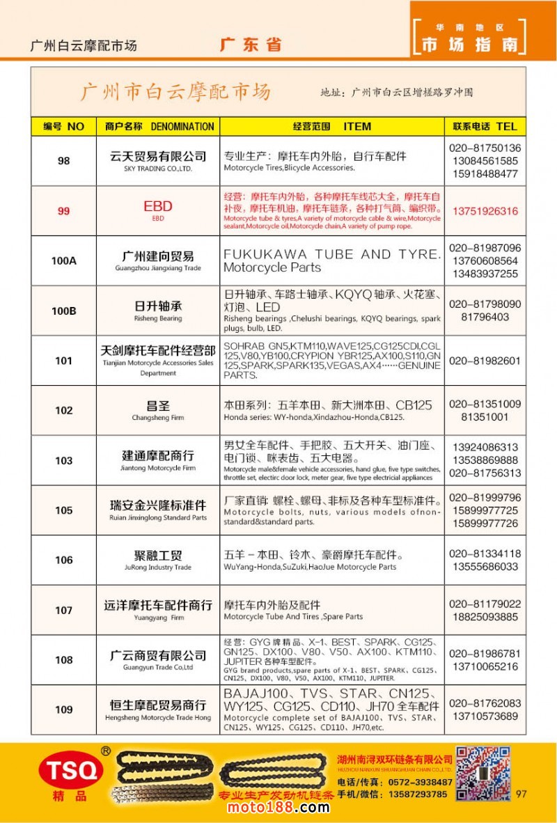最新升級的《摩配華南市場指南》升級版在第76屆廣州全國摩托車及配件展示交易會上首發,歡迎朋友們來3109號展位。接著將在廣州、重慶摩配市場全面派送,在廣州福星、松南市場門口、及白云三個檔口常年設立發行窗口;發行至廣州、重慶、江浙的幾大板塊主要廠家及全國的主要摩配市場。