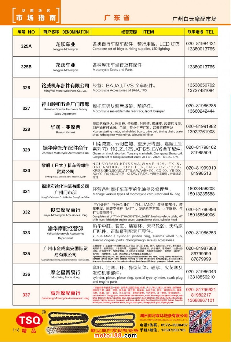 最新升級的《摩配華南市場指南》升級版在第76屆廣州全國摩托車及配件展示交易會上首發(fā),歡迎朋友們來3109號展位。接著將在廣州、重慶摩配市場全面派送,在廣州福星、松南市場門口、及白云三個檔口常年設(shè)立發(fā)行窗口;發(fā)行至廣州、重慶、江浙的幾大板塊主要廠家及全國的主要摩配市場。