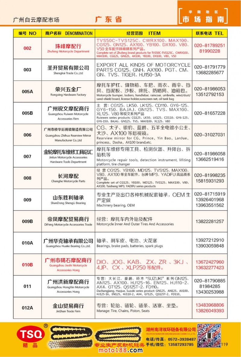 最新升級的《摩配華南市場指南》升級版在第76屆廣州全國摩托車及配件展示交易會上首發,歡迎朋友們來3109號展位。接著將在廣州、重慶摩配市場全面派送,在廣州福星、松南市場門口、及白云三個檔口常年設立發行窗口;發行至廣州、重慶、江浙的幾大板塊主要廠家及全國的主要摩配市場。