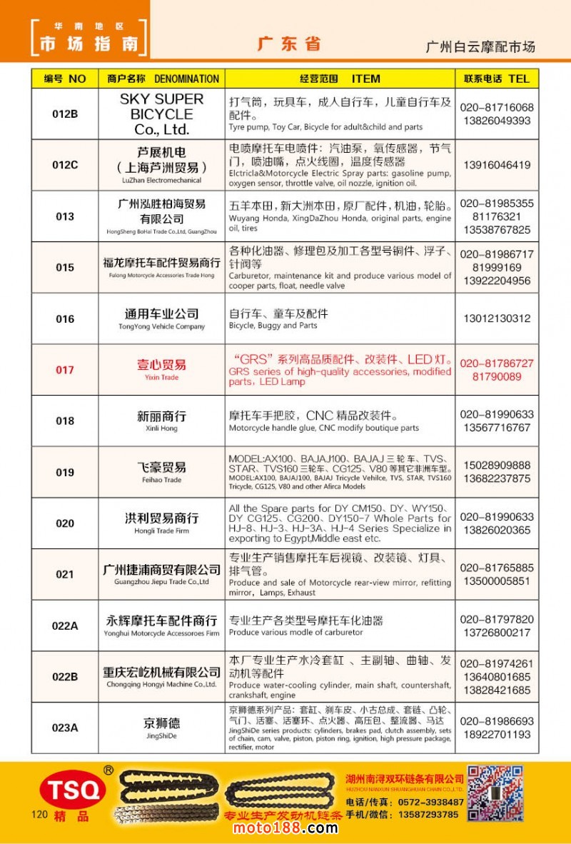 最新升級的《摩配華南市場指南》升級版在第76屆廣州全國摩托車及配件展示交易會上首發(fā),歡迎朋友們來3109號展位。接著將在廣州、重慶摩配市場全面派送,在廣州福星、松南市場門口、及白云三個檔口常年設(shè)立發(fā)行窗口;發(fā)行至廣州、重慶、江浙的幾大板塊主要廠家及全國的主要摩配市場。