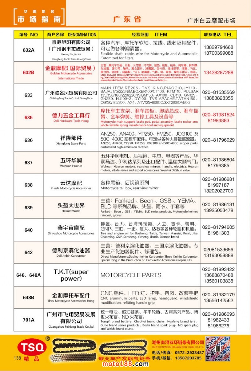 最新升級的《摩配華南市場指南》升級版在第76屆廣州全國摩托車及配件展示交易會上首發,歡迎朋友們來3109號展位。接著將在廣州、重慶摩配市場全面派送,在廣州福星、松南市場門口、及白云三個檔口常年設立發行窗口;發行至廣州、重慶、江浙的幾大板塊主要廠家及全國的主要摩配市場。