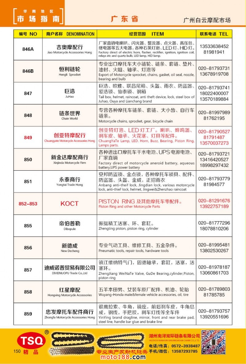 最新升級的《摩配華南市場指南》升級版在第76屆廣州全國摩托車及配件展示交易會上首發(fā),歡迎朋友們來3109號展位。接著將在廣州、重慶摩配市場全面派送,在廣州福星、松南市場門口、及白云三個檔口常年設(shè)立發(fā)行窗口;發(fā)行至廣州、重慶、江浙的幾大板塊主要廠家及全國的主要摩配市場。