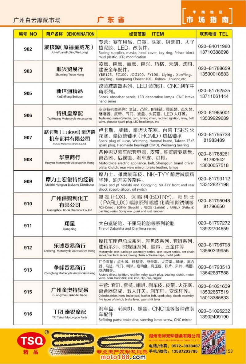 最新升級的《摩配華南市場指南》升級版在第76屆廣州全國摩托車及配件展示交易會上首發,歡迎朋友們來3109號展位。接著將在廣州、重慶摩配市場全面派送,在廣州福星、松南市場門口、及白云三個檔口常年設立發行窗口;發行至廣州、重慶、江浙的幾大板塊主要廠家及全國的主要摩配市場。