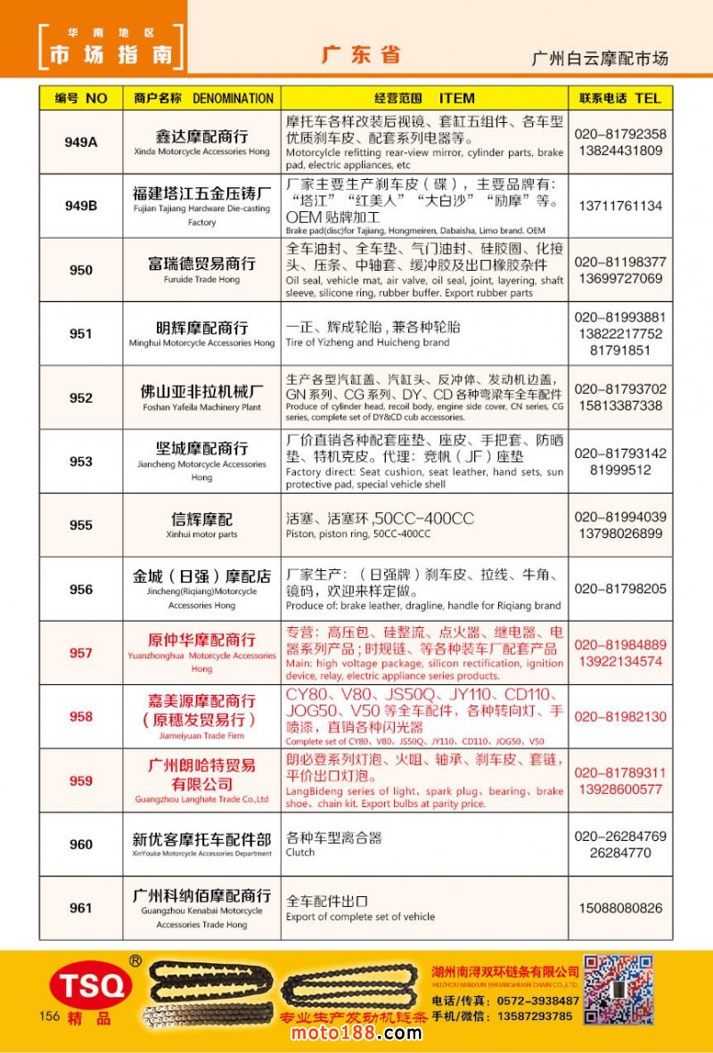 最新升級的《摩配華南市場指南》升級版在第76屆廣州全國摩托車及配件展示交易會上首發,歡迎朋友們來3109號展位。接著將在廣州、重慶摩配市場全面派送,在廣州福星、松南市場門口、及白云三個檔口常年設立發行窗口;發行至廣州、重慶、江浙的幾大板塊主要廠家及全國的主要摩配市場。