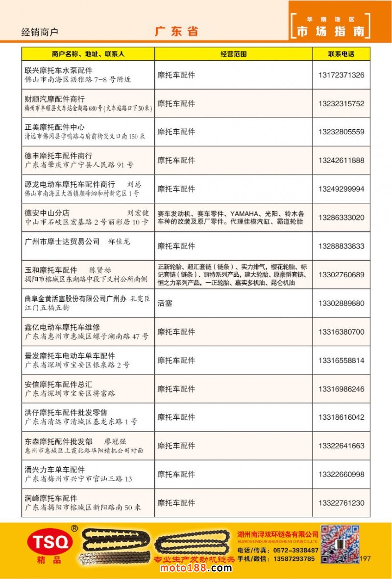 最新升級(jí)的《摩配華南市場(chǎng)指南》升級(jí)版在第76屆廣州全國(guó)摩托車及配件展示交易會(huì)上首發(fā),歡迎朋友們來3109號(hào)展位。接著將在廣州、重慶摩配市場(chǎng)全面派送,在廣州福星、松南市場(chǎng)門口、及白云三個(gè)檔口常年設(shè)立發(fā)行窗口;發(fā)行至廣州、重慶、江浙的幾大板塊主要廠家及全國(guó)的主要摩配市場(chǎng)。