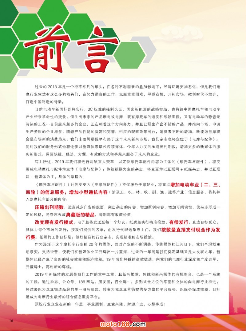 綜上所述,2019年我們將進行兩項重大變革:以定位摩托車配件內容為主體的《摩托車與配件》,將變更成電動摩托與配件為主體《電摩與配件》;傳統紙媒為主的雜志,將變更為以互聯網+紙媒雜志,并以互聯網+新媒體為主。具體的舉措為: