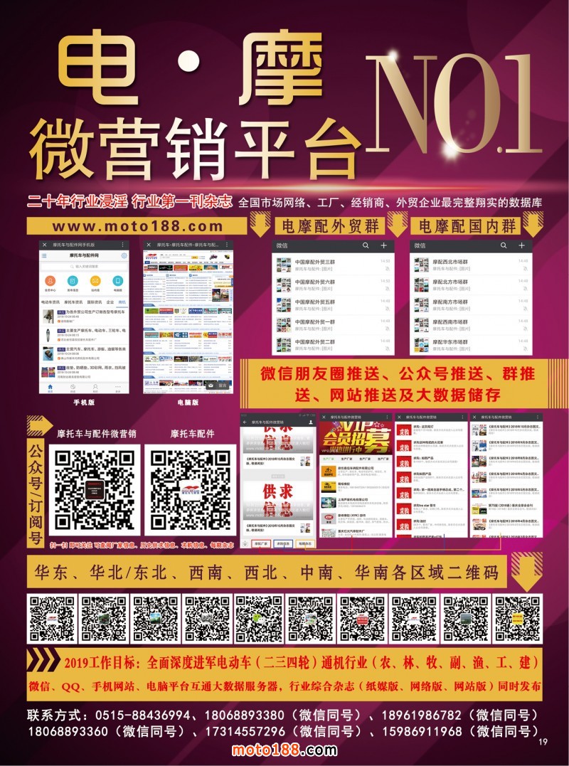 2019年新媒體的發展是我們工作的重中之重,且任務繁重,傳統和新興媒體的有機整合,也是一個系統的工程,通過雜志、公眾號、188網站,朋友圈,行業群…,多形式全方位的平面和立體的向電摩行業推進,將過去以為企業鍛造品牌的單一服務形式,轉變為我企業營銷提供多方位的平臺服務,以服務促成效益,目標是成為電摩行業最好的綜合信息服務平臺。