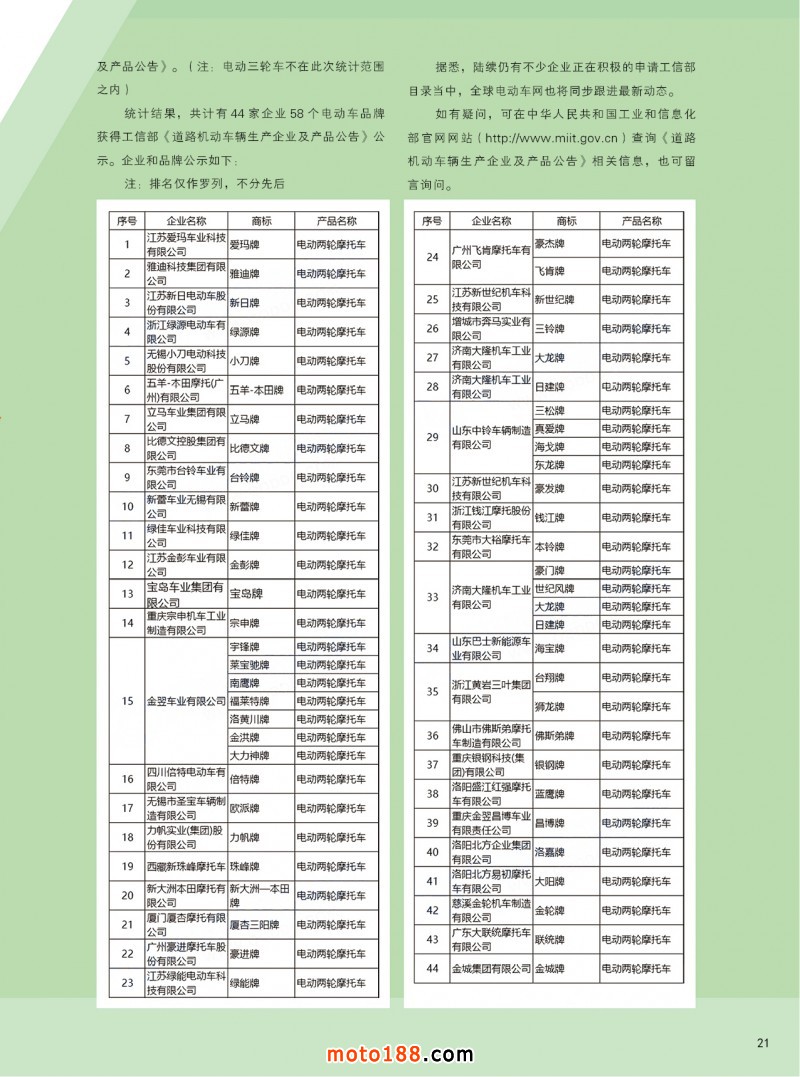 內21 重磅公布!工信部最全電摩品牌目錄,44家企業58個電動車品牌!