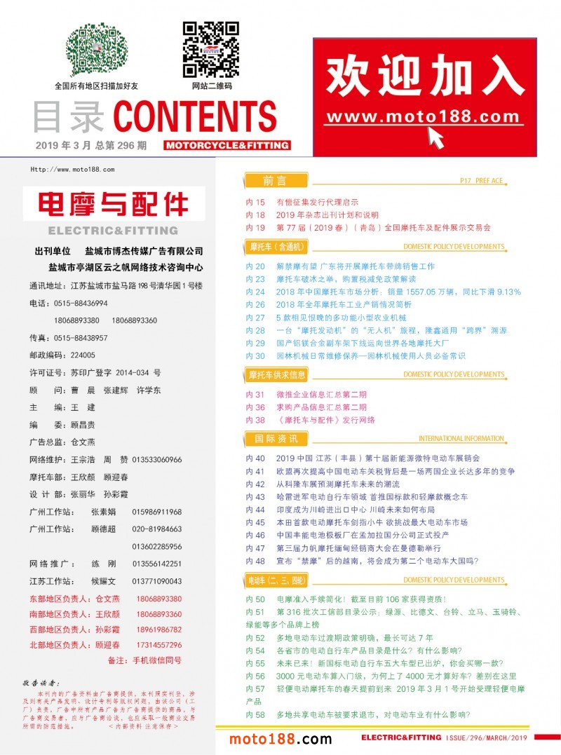 在這個春天里我們感受到和風拂面,我們更堅定了信心,我們傳統媒體務實的發展和經營,基礎工作在不斷的加厚夯實,今年我們雜志進行了大調整,一年只在銷售季里出刊,全年出刊四期精品,本期雜志就有許多重要信息發布:政策面上的行業和地方上的重要政策(如前所述),18年的市場數據匯總分析,通機產品技術介紹 ,行業有關的重要國際資訊,國際巨頭研發生產的情況動態,電摩行業電動三四輪及動力電池最新的國家和地方政策,從海量的信息里精挑細選,每一遍文章都能讓讀者開卷有限,同時還值得收藏。