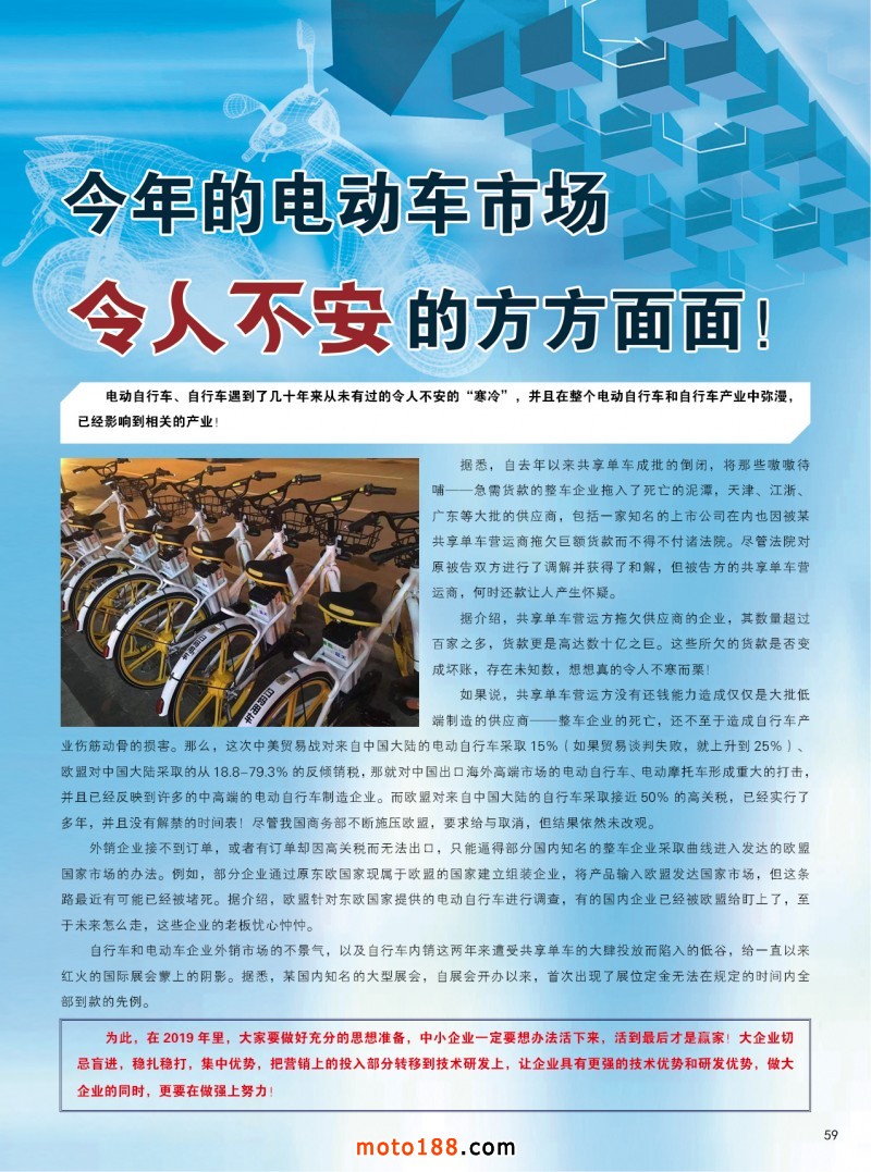 在這個春天里我們感受到和風(fēng)拂面,我們更堅(jiān)定了信心,我們傳統(tǒng)媒體務(wù)實(shí)的發(fā)展和經(jīng)營,基礎(chǔ)工作在不斷的加厚夯實(shí),今年我們雜志進(jìn)行了大調(diào)整,一年只在銷售季里出刊,全年出刊四期精品,本期雜志就有許多重要信息發(fā)布:政策面上的行業(yè)和地方上的重要政策(如前所述),18年的市場數(shù)據(jù)匯總分析,通機(jī)產(chǎn)品技術(shù)介紹 ,行業(yè)有關(guān)的重要國際資訊,國際巨頭研發(fā)生產(chǎn)的情況動態(tài),電摩行業(yè)電動三四輪及動力電池最新的國家和地方政策,從海量的信息里精挑細(xì)選,每一遍文章都能讓讀者開卷有限,同時(shí)還值得收藏。