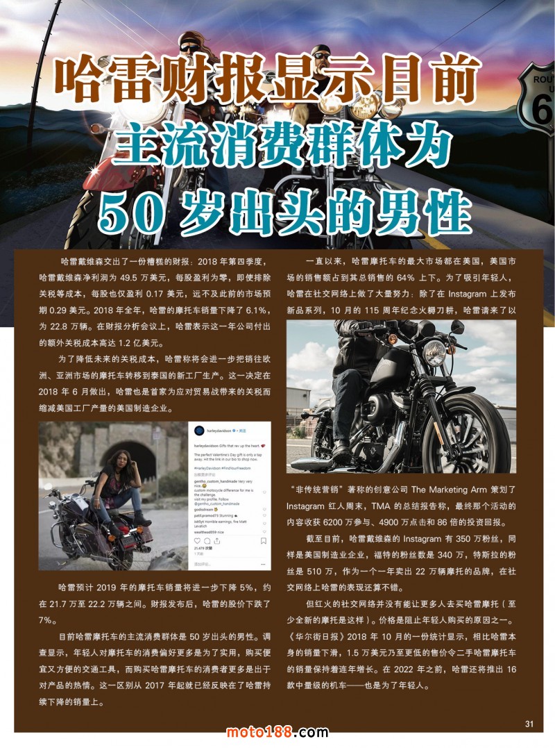 2019.5月《摩托車/電動(dòng)車與配件》雜志,歡迎大家閱讀日期:2019-05-08 點(diǎn)擊:1861 查看原圖 全部展開(kāi)![]() ![]() ![]() 內(nèi)31 哈雷財(cái)報(bào)顯示目前主流消費(fèi)群體為50歲出頭的男性