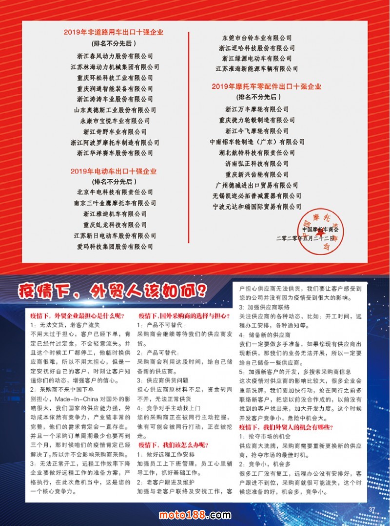 2020年注定是一個不平凡的年頭,今年的新冠疫情正在全球流行,病毒無時無刻不在向人類發起攻擊。我們國內除年初,一場大的疫情被控制外,在不同的地區分別出現了小規模的流行,對我國的經濟帶來了一定程度的影響,對我們行業最直接的影響就是上半年的杭州全國摩托車展會不得不取消。祈禱下半年疫情不要反撲,我們廣州的全摩會能順利的召開,讓全國的同仁有一個相聚的機會。