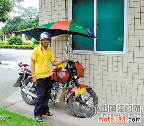 6月13日早上,江海交警大隊(duì)一中隊(duì)民警和協(xié)管員在東海路設(shè)卡對(duì)過(guò)往車(chē)輛進(jìn)行檢查。9時(shí)許,執(zhí)勤民警遠(yuǎn)遠(yuǎn)就發(fā)現(xiàn)有一輛加裝了一把大傘的兩輪摩托車(chē)迎面駛來(lái),馬上示意該車(chē)靠邊停車(chē)接受檢查。湖南籍的駕駛員何××說(shuō):“最近天氣時(shí)雨時(shí)晴,我想摩托車(chē)也像小汽車(chē)那樣遮風(fēng)、擋雨、防曬,所以就加裝了一把遮陽(yáng)傘。”執(zhí)勤民警對(duì)其進(jìn)行嚴(yán)肅的批評(píng)教育,責(zé)令何××馬上將傘拆除,并依法暫扣該違法車(chē)輛,作進(jìn)一步處理。