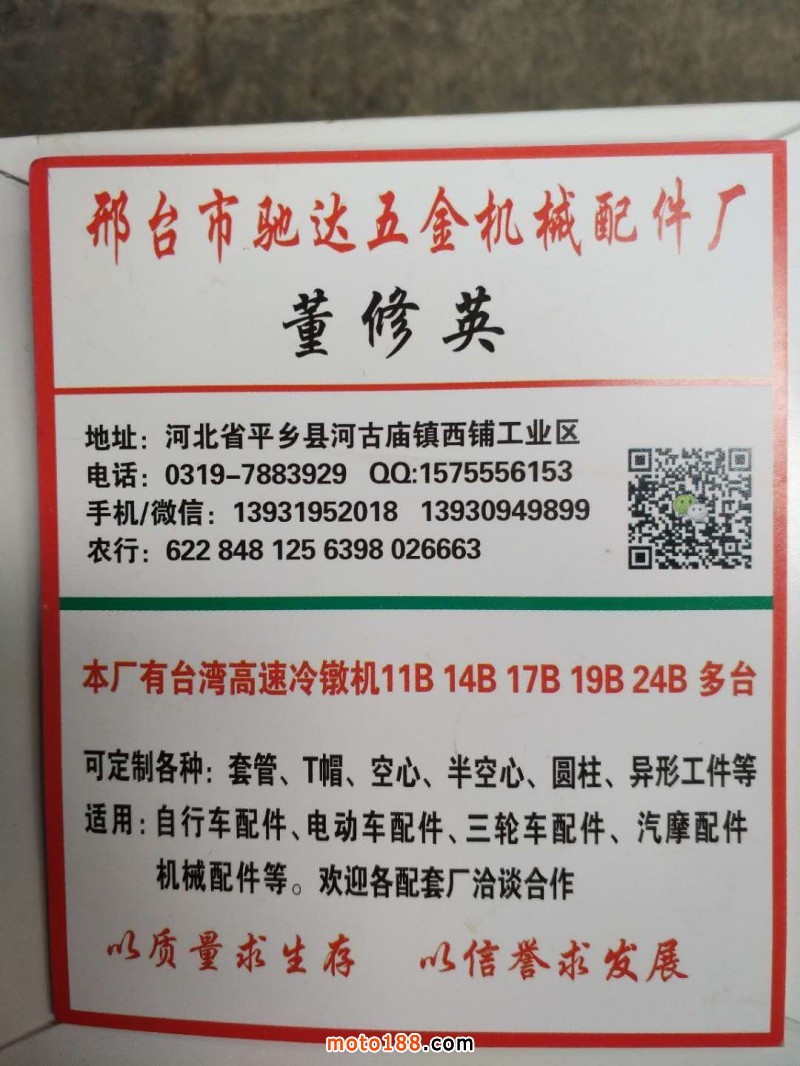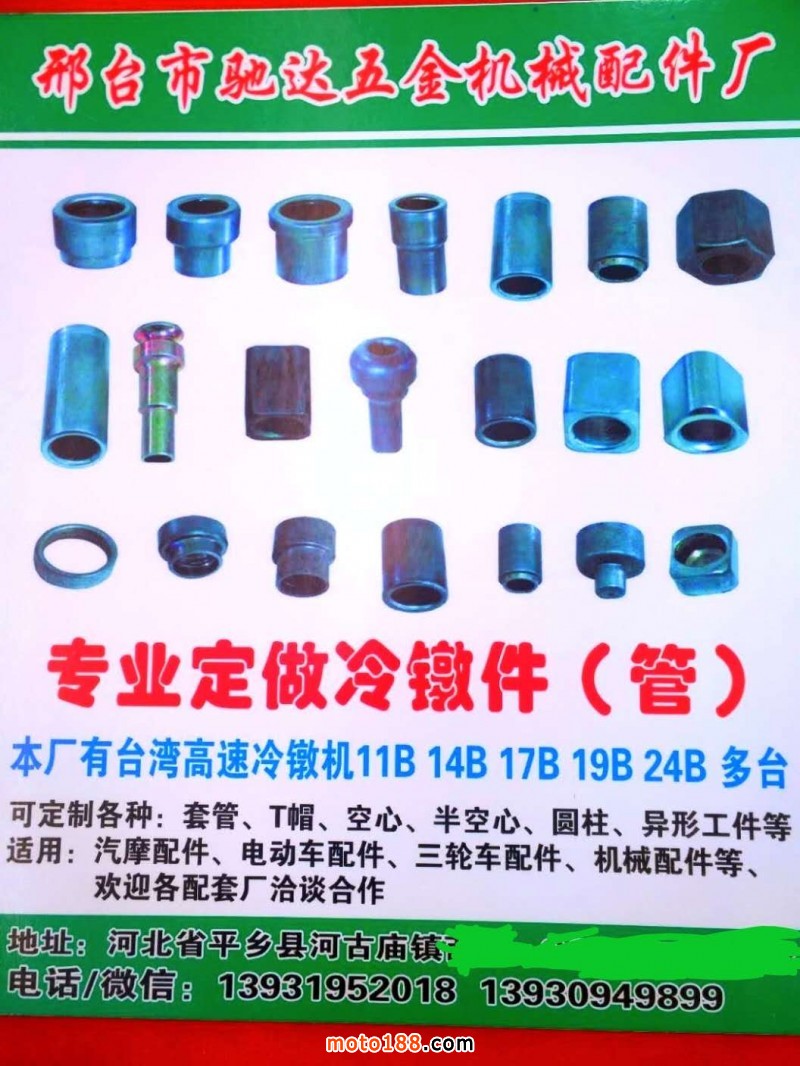 河北邢臺馳達五金機械配件廠擁有臺灣機多臺專業生產各種冷墩件、管件等異型件,主要用于汽摩配件、機械配件、五金工具、電動自行車配件、精密機械配件等均可加工定制(定制直徑5mm-30mm,長度5mm-100mm)。