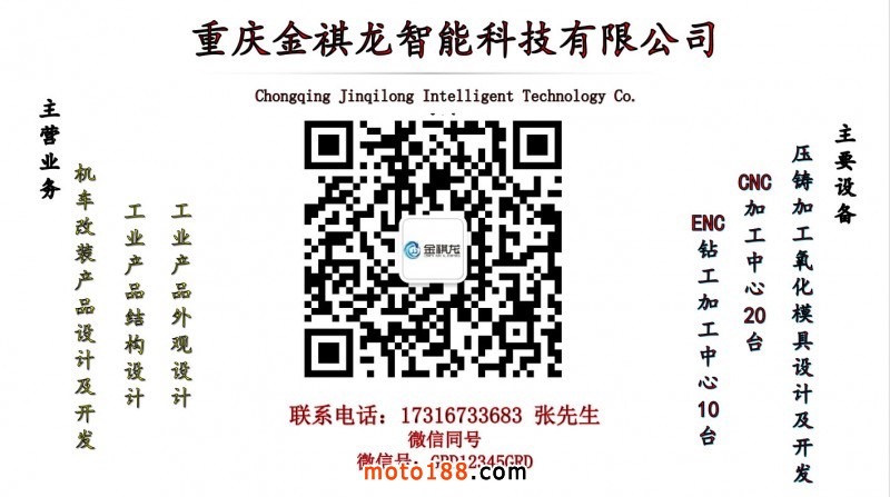 重慶金祺龍智能科技有限公司聯系方式:17316733683(張先生 微信同號 )15730156629(王先生 微信同號 )。本公司專業從事新能源汽車、摩托車、電動車、PC塑料件、CNC精雕、模具設計、產品設計的研發、生產、銷售的高新技術企業,位于重慶市合川區合川工業園高陽路1688號田中集團。公司配置專業的研發團隊,規范的生產線,嚴格的質檢流程,完善的售后對接。現目前已有18款專利產品,并均取得質檢認證。不同定價的多個系列產品均具有超高的性價比。誠征全國各地采購商、經銷商前來洽談!