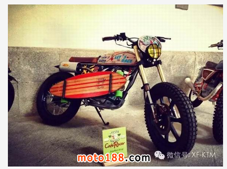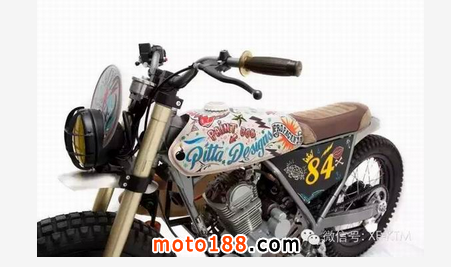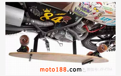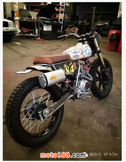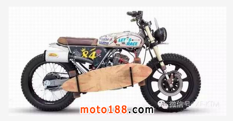 手工改裝廠Dream Wheels 幾年前開始著手改裝Honda CLR125 ,因?yàn)镃LR125 成本低廉又有著可靠的引擎,非常適合穿梭在街頭,是一個非常好的改裝素材。而今天這臺CITYFLY原本只是臺pizza車 ,經(jīng)過Dream Wheels巧手,換上 RMX50前叉、復(fù)古手把與開關(guān)、復(fù)古圓燈、LED尾燈、XS400 18寸前鋁框 后面搭配鋼絲框、油箱彩繪、等.... 最后再加上那個畫龍點(diǎn)睛的滑板架,街頭復(fù)古風(fēng)一拜!