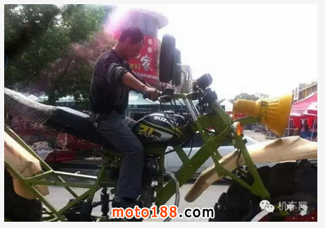 “輪子是250拖拉機(jī)的輪胎,避震器是三輪拖拉機(jī)的避震器,前面的大燈是探照燈。發(fā)動機(jī)是用普通摩托車的發(fā)動機(jī)改裝的,時速能達(dá)到每小時40碼,不過變速箱是我自己設(shè)計,用了之后可以輕松爬坡”。