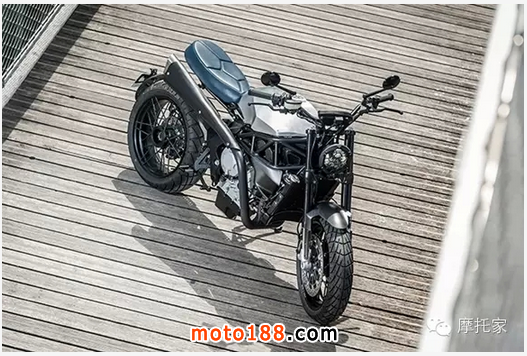 這輛Lara 800是基于MV Agusta Brutale 800打造,原車本來就擁有出色的性能,無論是機械還是電子件幾乎都用上了最好部件,因此基于此打造出的Scrambler性能毋庸置疑。Lara 800絕對是一輛陽剛氣十足的車,激進的車身設計向外界傳達出的訊息不言而喻。而手工打造的一體式鋁合金油箱及車座上包裹著高等級的藍色皮革,細致的做工加之完美的比例,又透出一股法蘭西式低調奢華。