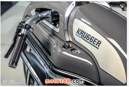 這輛Cafe Racer風格的改裝版BMW K1600,就是一個摩托車與Art Deco藝術風格融合的完美體現。這輛車是由比利時人Freddie的改裝公司“Krugger Motorcycles”改裝的,Freddie的公司改裝過多款車,是美國邦尼維爾的常客,相信這輛Krugger K1600也會亮相明年的鹽湖。這款車采用的是BMW K1600的動力單元——并列6缸發動機,而剩下的車架、輪轂、車把以及油箱等都進行了徹底的改裝,輪轂采用的是前21寸后20寸的大輪轂設計,前后均為單側搖臂設計,車把可調整角度,同時油箱的加油口被設計在了車座后面,加油口上的駝峰也可改成車座,變成雙座版。