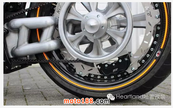 核心提示: 軟尾Cafe racer的軟尾改法讓人耳目一新。凌厲的線條一改軟尾固有的圓潤風格,21寸前后輪轂,單側擺臂,一體式車叉,咖啡賽式