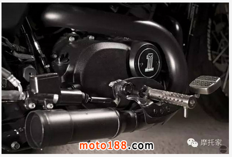 在原裝座椅上安裝了一個定制坐墊,重置了點火鎖和喇叭使外觀看起來更加簡潔一體。在廉價摩托車上會看到的線束也被部分隱藏。中控噴上黑漆并打孔裝上了哈雷的“Silencer”腳踏。