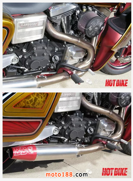 BBC的創(chuàng)始人Kevin在解釋這幅作品時(shí)說,其實(shí)這臺街霸改裝不是簡單塑造badass的形象,更是匠心獨(dú)運(yùn)地融合了BBC產(chǎn)品線中所有為哈雷戴納車系設(shè)計(jì)的改裝件,包括整流罩、邊箱、前叉、電池箱蓋、電線線束,以及戴納排氣管等等。難怪它的風(fēng)格會(huì)如此統(tǒng)一!