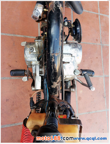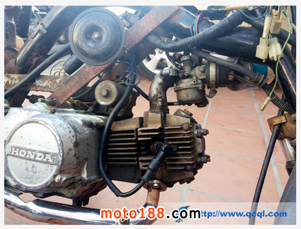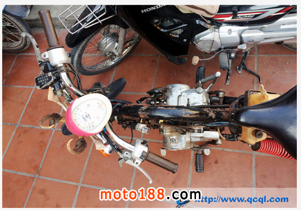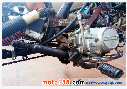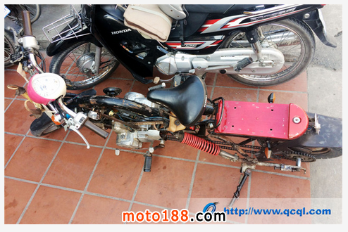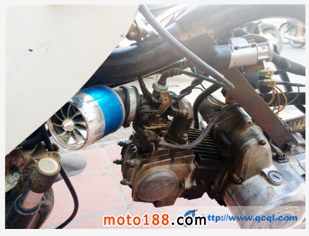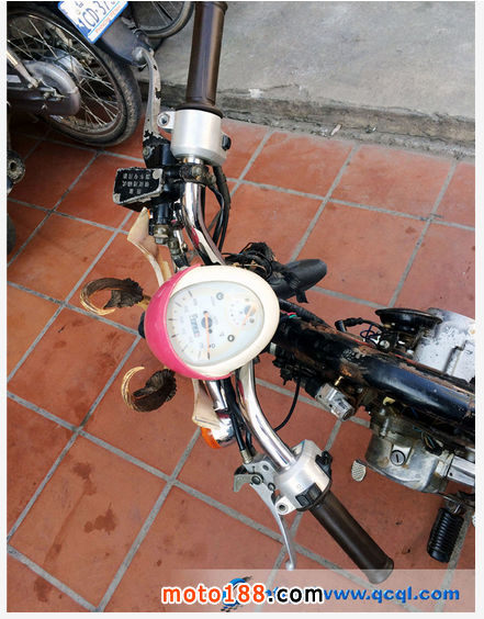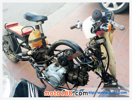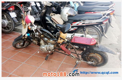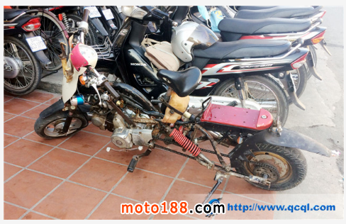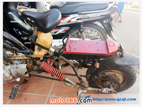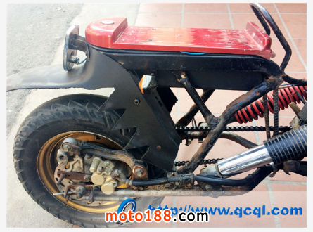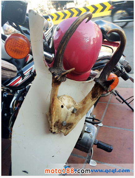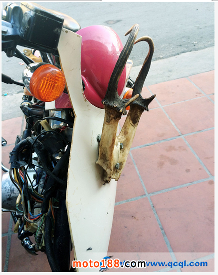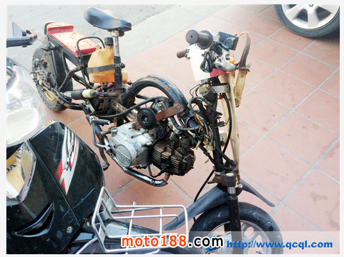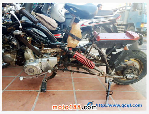 一部來自街頭的作品,搭載了一副 Honda Cub 50 的臥式發動機,踏板車/迷你車的 10 英寸前、后車輪,前鼓后碟的制動系統,渦輪狀的空氣濾清器,Honda Scoopy 踏板車的儀表板,“ 炸街 ” 級的排汽管,“ 不對稱 ” 的后雙筒減震器,自行車的 “ 標配 ” 鞍座,隨意可見縫縫補補的主車架和后擺臂,制作者似乎把身邊能拿來一用的所有物品都往這車上糊 ...而車頭的一對羊角,卻也仿佛是有意無意凸顯了作坊附近的環境。