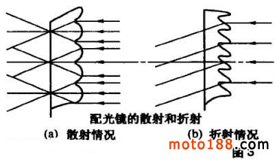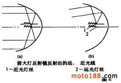 2. 反射鏡的構(gòu)成及特點(diǎn)反射鏡一般俗稱(chēng)“燈碗”。前燈燈泡的遠(yuǎn)光功率一般為 20 ~ 80W ,近光功率一般為 10 ~ 35W ,但目前使用規(guī)格一般為 12V35W/35W 燈泡。在這樣的功率下,散射光線(xiàn)只能照明車(chē)前 3 ~ 5m 的路面,所以,摩托車(chē)前照燈都設(shè)有反射鏡。它將燈泡的散射光線(xiàn)聚合反射成向前或向前下方的平行光線(xiàn),如圖2 。