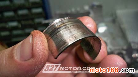 這是一輛有些年份的CB400,可以看到在活塞的側面有兩個不同的顏色,中間顏色比較淺的部位,是因為引擎尚未達到正常的工作溫度,由于活塞本身的是并非是真圓,因此需要等達到工作溫度時,藉由熱脹冷縮的效益,才會達到真圓!而在冷車時,很多人都會耍帥的轟油門,長期下來就是造成這個異常磨損的現象。