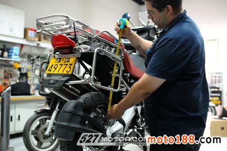 在了解車(chē)主與車(chē)輛的基本資訊之后,Michael首先會(huì)測(cè)量輪胎在離地時(shí),前后懸掛行程的總長(zhǎng)度,然后測(cè)量車(chē)輪著地之后懸掛行程所剩余的長(zhǎng)度,緊接著讓騎士坐愛(ài)車(chē),再測(cè)量車(chē)輛懸掛在承載騎士重量之后的前后懸吊長(zhǎng)度。