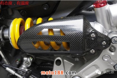 負(fù)角度的后減震方案也是1199的技術(shù)革命之一,裸露在外的黃色減震非常的養(yǎng)眼,碳纖維減震護(hù)蓋取代了原來的ABS塑料護(hù)蓋。