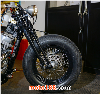 開工之前,先要構思,確定改裝的整體方向和細節的雕琢。首先,我把目光放到懸掛上,在一番斟酌之后決定采用簡單明了又有復古原始味道的彈簧頭的前減震,搭配封閉式的后減震又能從視覺上看起來使車架很整。然后就是輪圈,我們選擇前后等大16*3.5寸的輻條式輪圈,配的是復古鋸齒輪胎,營造粗獷的視覺效果。