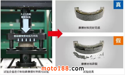 真假制動蹄經3.43兆帕額定壓強剪切試驗后,摩擦材料受損情況對比:
