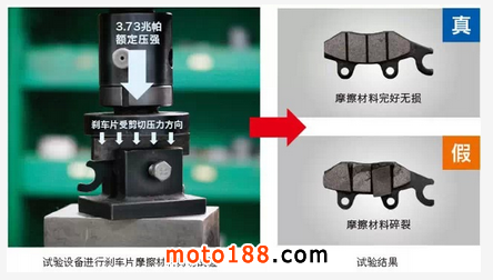 純正剎車片的摩擦材料采用銅基抗磨材料,經特殊工藝壓制而成,硬度適中,與制動盤匹配良好,既保證了制動穩定可靠,又確保磨損率小,壽命長;純正剎車片生產工藝嚴格,保證了摩擦材料在金屬板上粘接牢固,摩擦材料不易碎裂。純正剎車片在水中、雨中或高溫連續剎車時摩擦力衰減小,保證了停車安全。劣質剎車片的摩擦材料材質差,摩擦系數不夠,不能提供足夠的制動力,導致剎停距離明顯增加,撞車的風險大增。