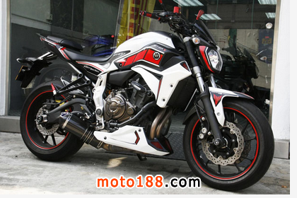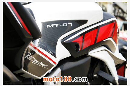 首先,這臺MT07貼上Yamaha周年版拉花車身貼紙連輪圈貼,外觀非常醒神,加上 兩邊的水箱邊冚及肚兜冚,營造STREETFIGHTER車款的感覺。另外,添置了實用的SW-MOTECH保護支架、TERMIGNONI排氣喉、 LIGHTECH腳踏、OHLINS尾避震、BREMBO直泵牛角、碳纖維尾沙板及多項RIZOMA優質改裝部品等等........,令車款外觀與性能 也有所提升及美化。