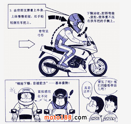 ③使你的體重仍在雙側的踏板上,上身向前傾斜,兩手自然放在摩托車兩側的手把上。