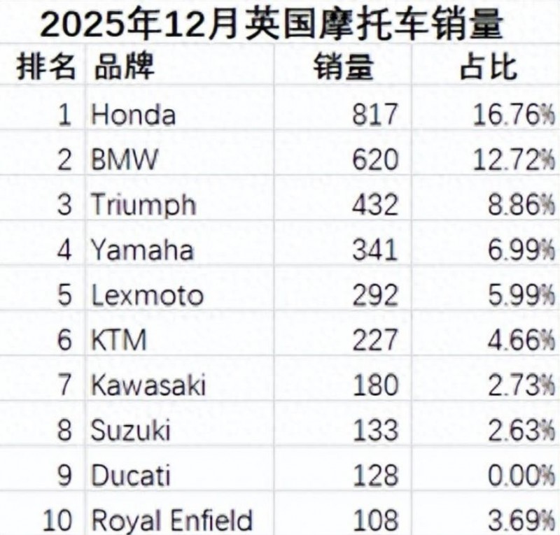 核心提示:2025年全年英國摩托車銷售了93922輛,同比下降19.31%。2025年12月英國摩托車銷量4876輛(包括燃油和電動摩托車),環比下降7.02%,